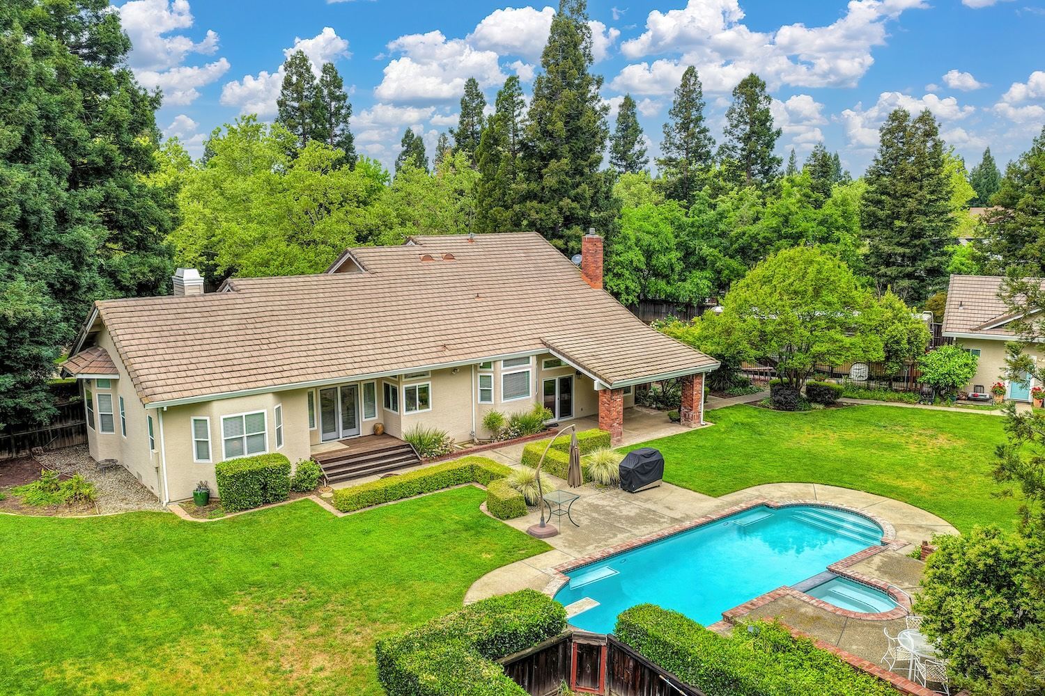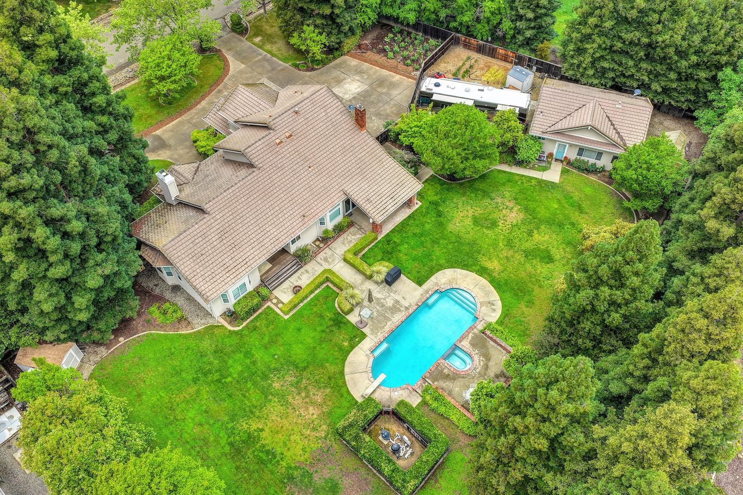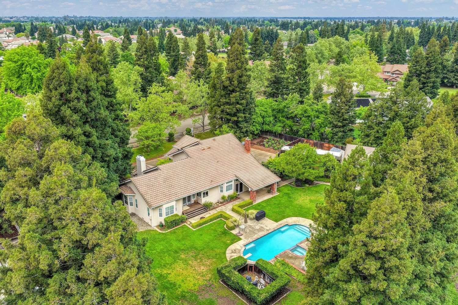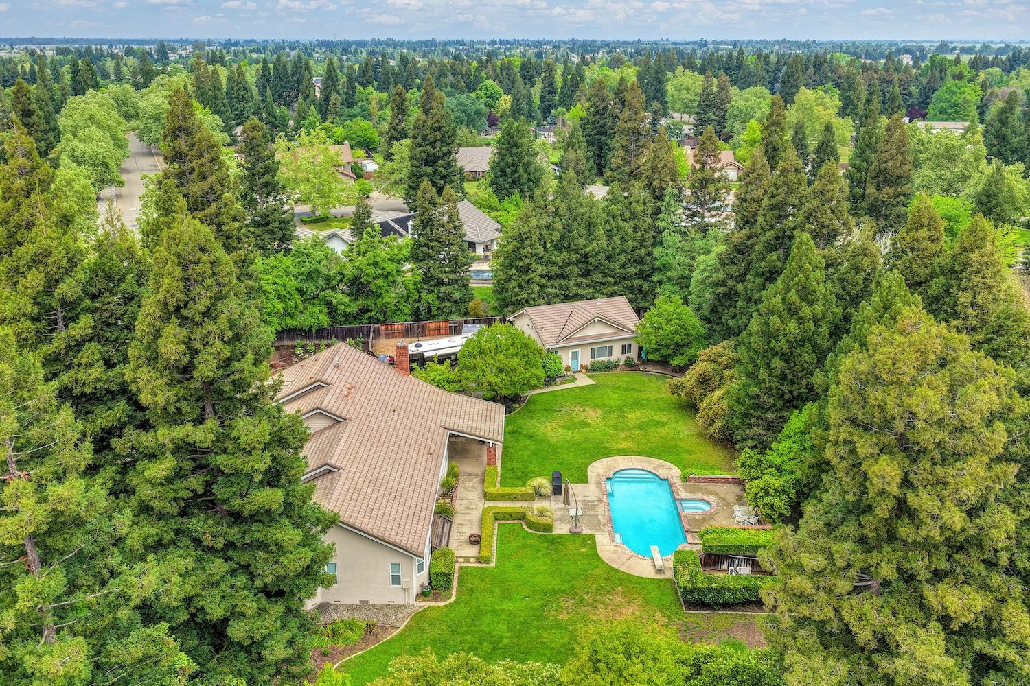 Set on a sprawling 1.1-acre lot in the sought-after neighborhood of Silver Springs, this beautifully maintained Elliott-built residence offers space, flexibility, and thoughtful upgrades in a prime location. Designed with both everyday living and entertaining in mind, the functional floorplan features a desirable main-level primary suite, an additional first-floor bedroom, two upstairs bedrooms, and a versatile bonus room. The heart of the home showcases a fully remodeled kitchen with abundant cabinetry, double ovens, and a seamless connection to the main living areas. Rich engineered Brazilian cherry hardwood flooring, alder cabinetry, and multiple French doors create a warm yet elevated aesthetic, while remodeled bathrooms and a spa-inspired primary suite with an oversized jetted tub and walk-in shower add to the home's comfort and appeal. Step outside to your own private retreat, complete with a pool and spa, expansive grounds, mature landscaping, and endless potential for outdoor living. The property is fully fenced and includes RV access with power, a three-car garage with workspace, a greenhouse, rose garden, and shed, ideal for hobbyists, gardeners, or those needing additional storage. Adding to the exceptional versatility of this home is the detached guest house which offers approximately 840 square feet of independent living space with its own kitchen, living area, bedroom, bathroom, laundry, and private entrance. A great option for multigenerational living, extended guests, or income potential. With extensive updates completed over the years, permitted improvements, and pride of ownership throughout, this is a unique opportunity to own a property that combines acreage, functionality, and lifestyle, all with no HOA and within close proximity to everyday conveniences.
