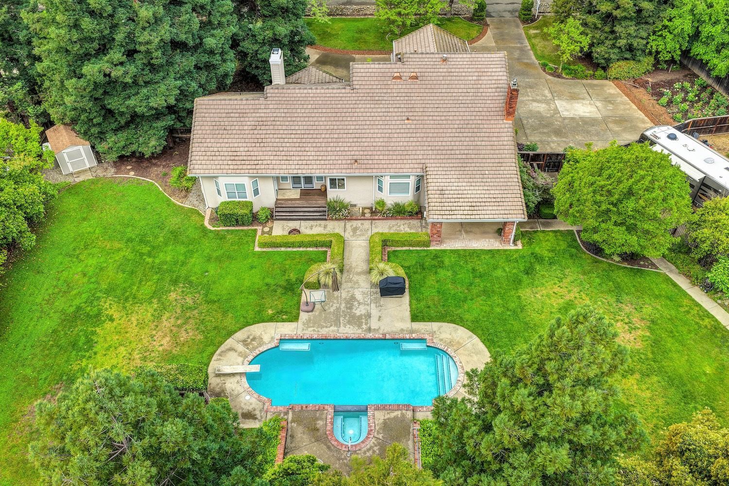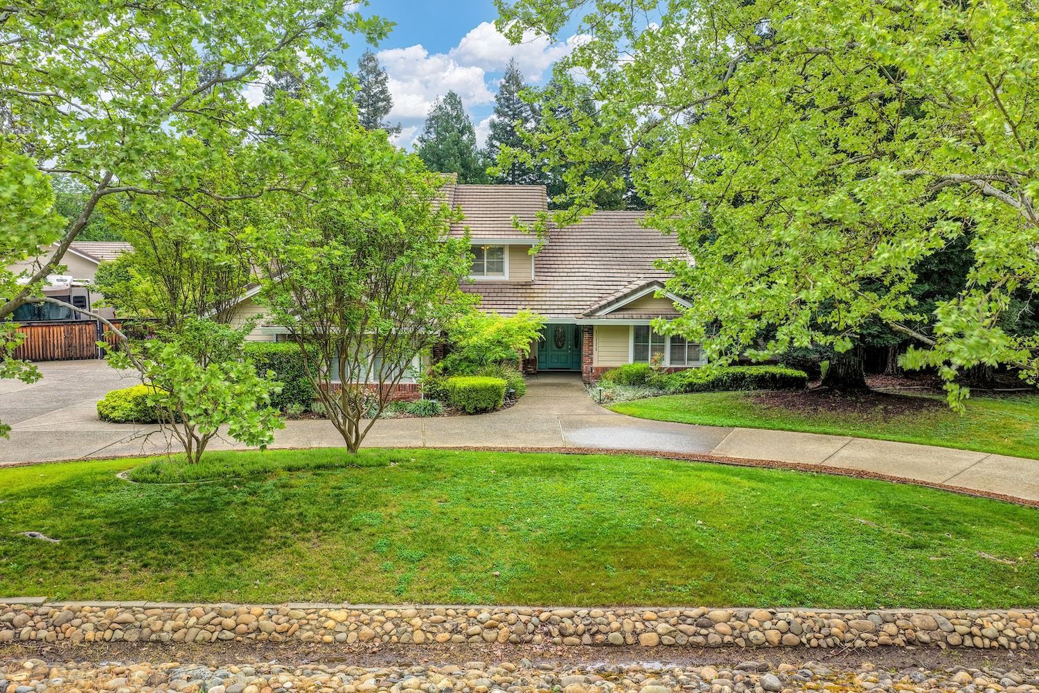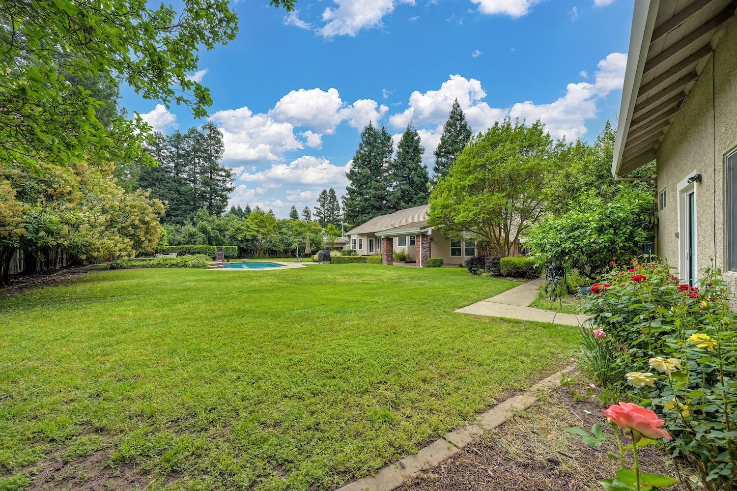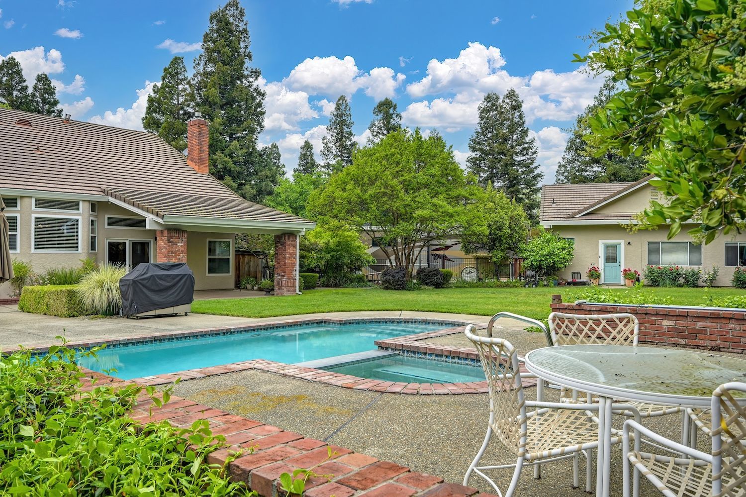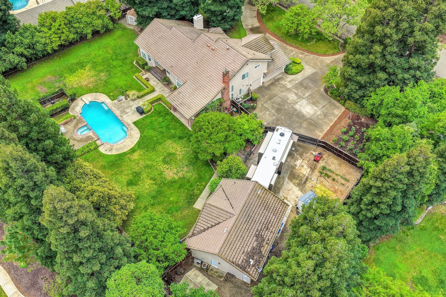Set on a sprawling 1.1-acre lot in the sought-after neighborhood of Silver Springs, this beautifully maintained Elliott-built residence offers space, flexibility, and thoughtful upgrades in a prime location. Designed with both everyday living and entertaining in mind, the functional floorplan features a desirable main-level primary suite, an additional first-floor bedroom, two upstairs bedrooms, and a versatile bonus room. The heart of the home showcases a fully remodeled kitchen with abundant cabinetry, double ovens, and a seamless connection to the main living areas. Rich engineered Brazilian cherry hardwood flooring, alder cabinetry, and multiple French doors create a warm yet elevated aesthetic, while remodeled bathrooms and a spa-inspired primary suite with an oversized jetted tub and walk-in shower add to the home's comfort and appeal. Step outside to your own private retreat, complete with a pool and spa, expansive grounds, mature landscaping, and endless potential for outdoor living. The property is fully fenced and includes RV access with power, a three-car garage with workspace, a greenhouse, rose garden, and shed, ideal for hobbyists, gardeners, or those needing additional storage. Adding to the exceptional versatility of this home is the detached guest house which offers approximately 840 square feet of independent living space with its own kitchen, living area, bedroom, bathroom, laundry, and private entrance. A great option for multigenerational living, extended guests, or income potential. With extensive updates completed over the years, permitted improvements, and pride of ownership throughout, this is a unique opportunity to own a property that combines acreage, functionality, and lifestyle, all with no HOA and within close proximity to everyday conveniences.