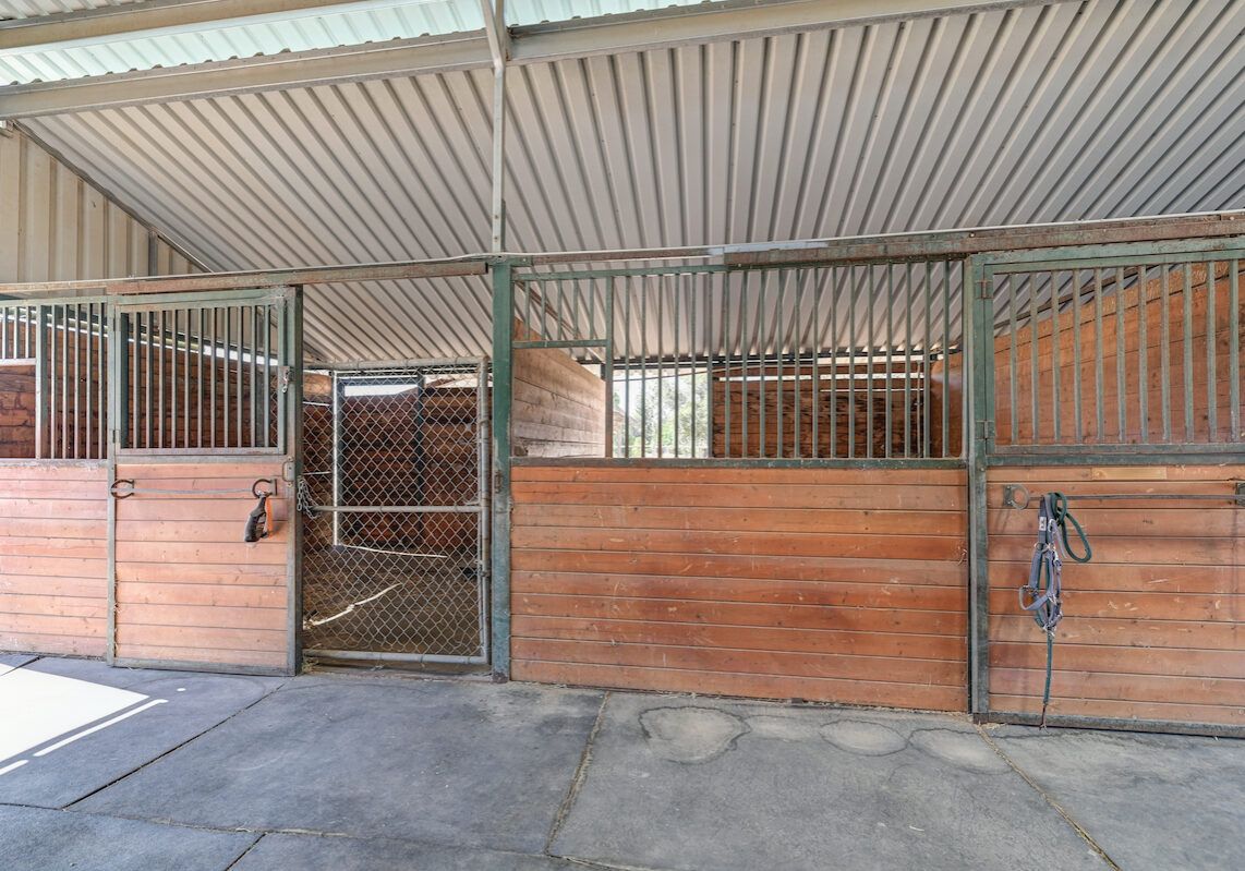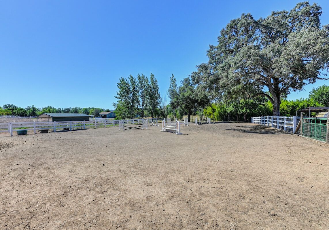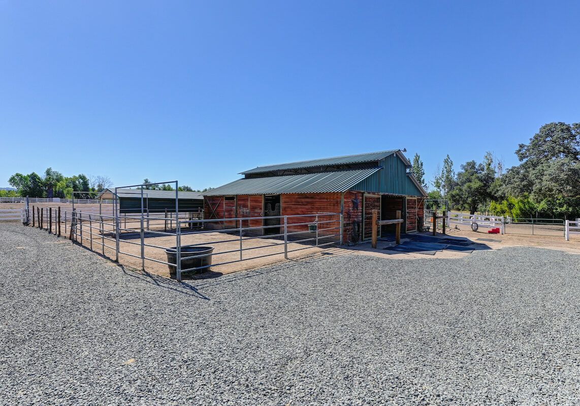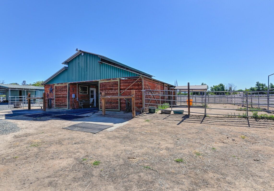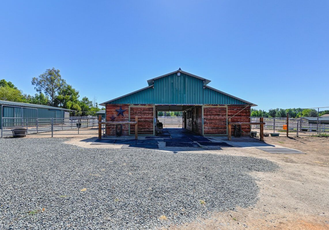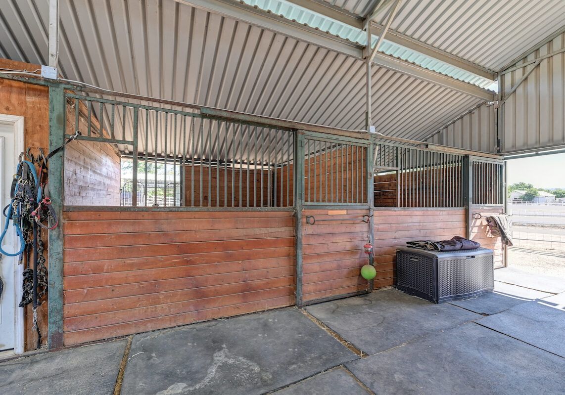 Welcome to this equestrian’s dream, exceptionally maintained and enhanced 4.8-acre property. The flat parcel features 2 houses: a single-story main house with 4 bedrooms and 2.5 bathrooms and a 1-bedroom, 1 bathroom guest house with kitchenette, living space, loft, and laundry. The main house offers an open floor plan, Coretec vinyl plank flooring, shutters, crown molding, and a whole house fan. The horse amenities include a Castlebrook raised center aisle barn with 4 stalls, feed room/hay storage, tack room and optional Dutch doors, a full-sized riding arena with a decomposed granite base, turnout paddock, and multiple pastures and pen areas. Additionally, the fully fenced acreage boasts a private iron gate entry, pebbletec pool with Cabo shelf, Generac 22kw generator, goat barn with 2 stalls and 2 run in shelters, 3 sheds, trailer pad, and a ~1,200 sq. ft. metal shop with 220 electrical. To top it off, this property also has Vulcan fire resistant vents and a 2,500-gallon holding tank with connection for the fire department.