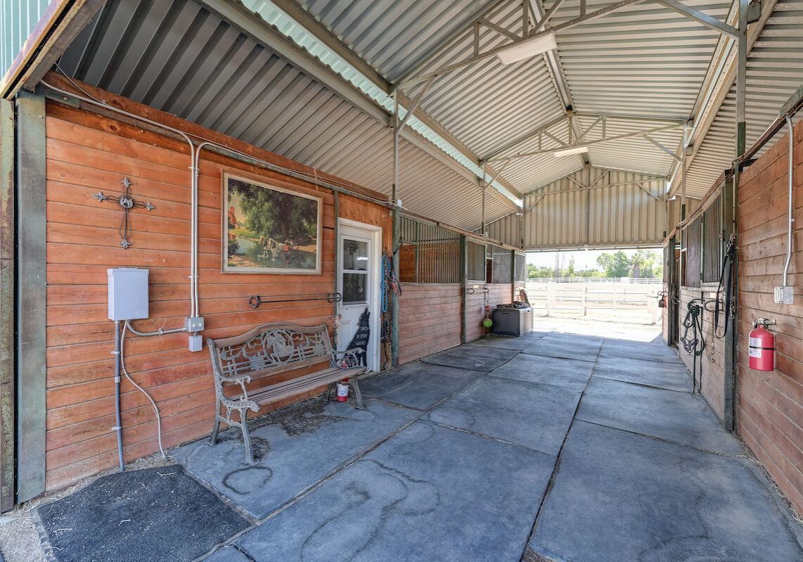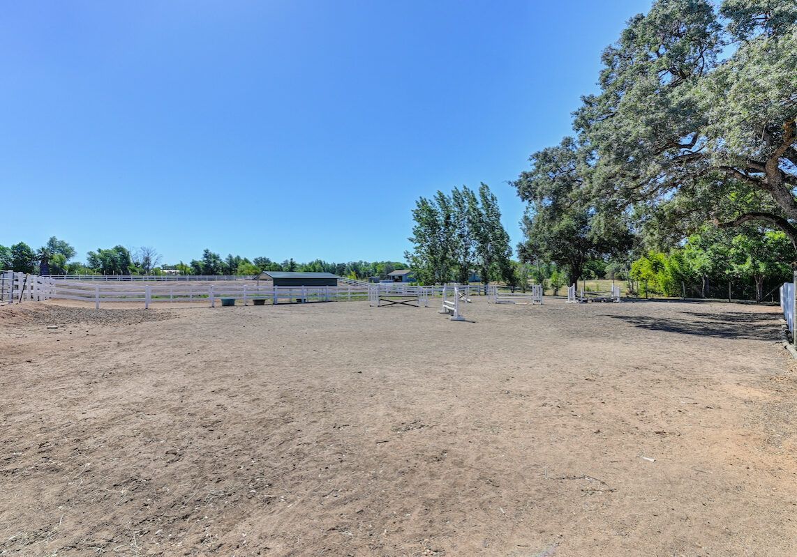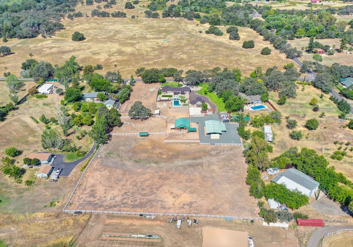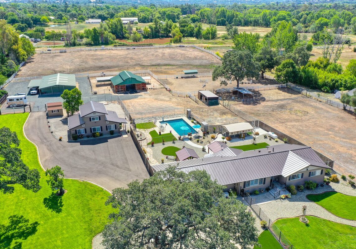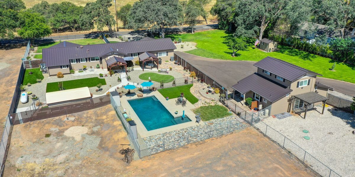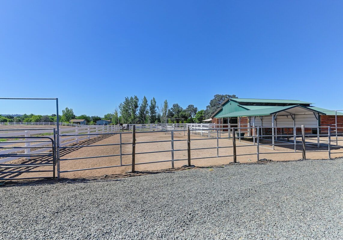 Welcome to this equestrian’s dream, exceptionally maintained and enhanced 4.8-acre property. The flat parcel features 2 houses: a single-story main house with 4 bedrooms and 2.5 bathrooms and a 1-bedroom, 1 bathroom guest house with kitchenette, living space, loft, and laundry. The main house offers an open floor plan, Coretec vinyl plank flooring, shutters, crown molding, and a whole house fan. The horse amenities include a Castlebrook raised center aisle barn with 4 stalls, feed room/hay storage, tack room and optional Dutch doors, a full-sized riding arena with a decomposed granite base, turnout paddock, and multiple pastures and pen areas. Additionally, the fully fenced acreage boasts a private iron gate entry, pebbletec pool with Cabo shelf, Generac 22kw generator, goat barn with 2 stalls and 2 run in shelters, 3 sheds, trailer pad, and a ~1,200 sq. ft. metal shop with 220 electrical. To top it off, this property also has Vulcan fire resistant vents and a 2,500-gallon holding tank with connection for the fire department.