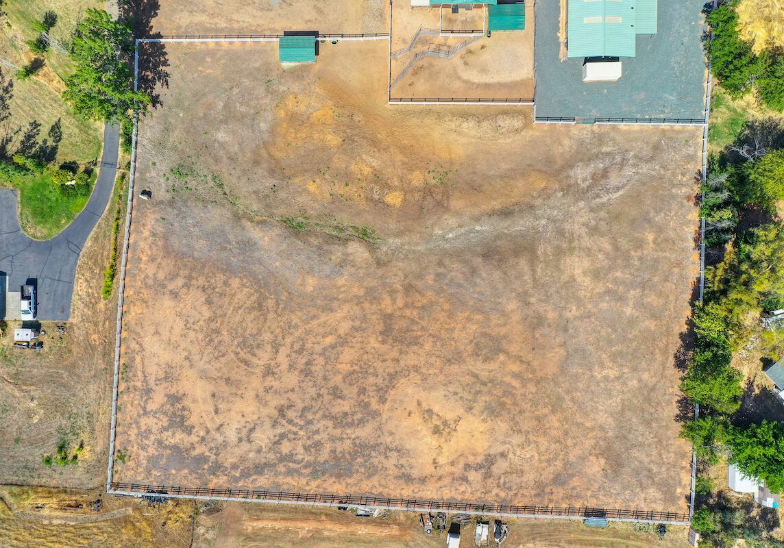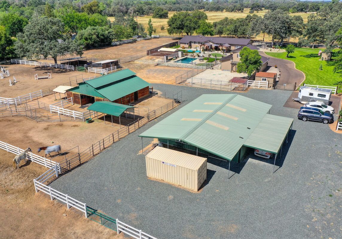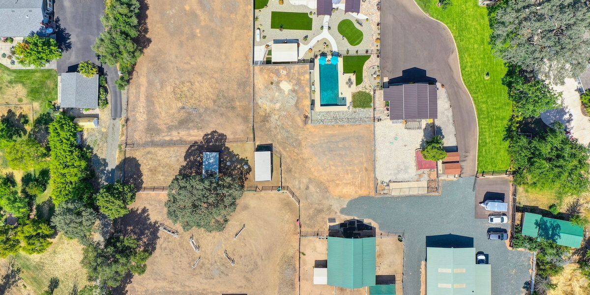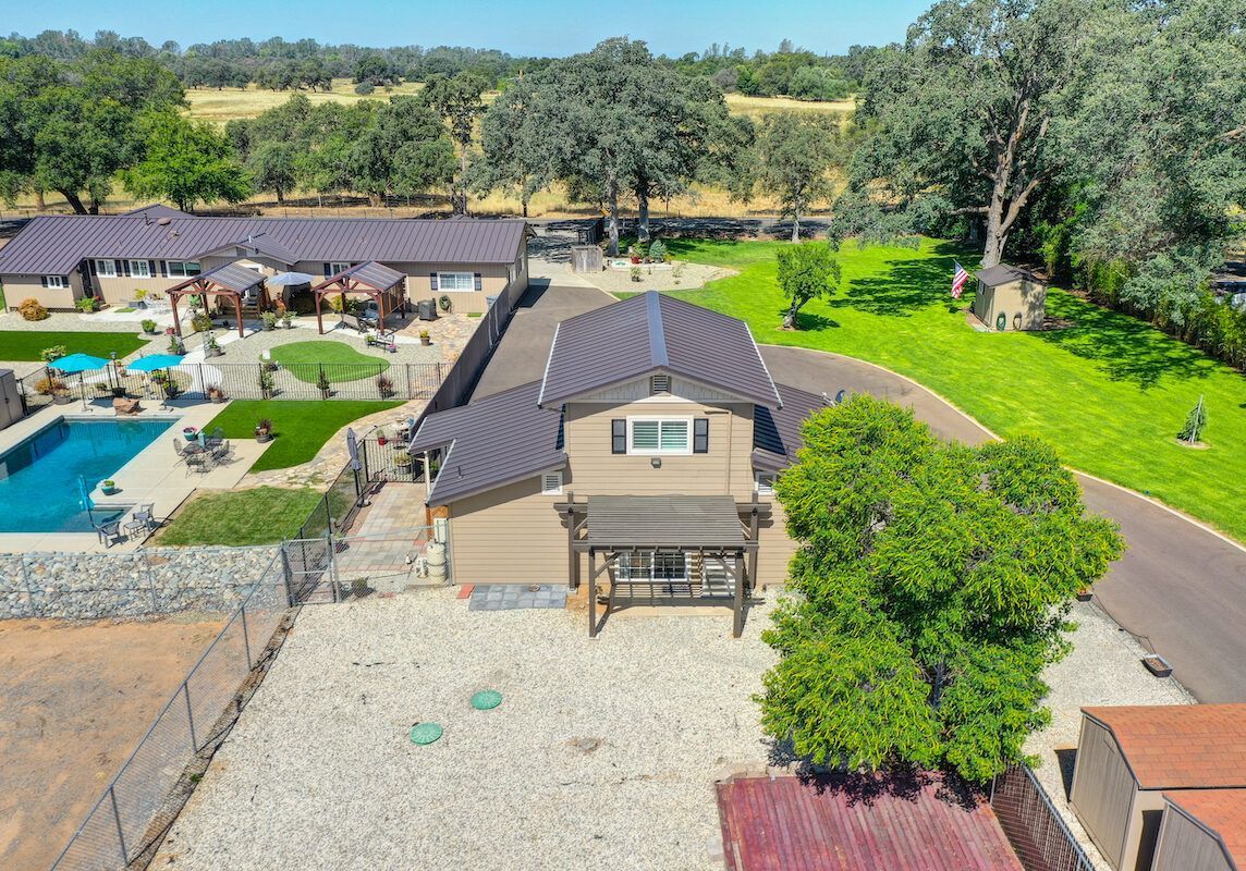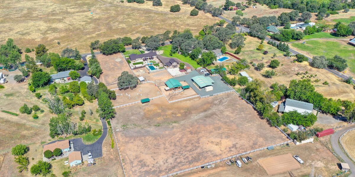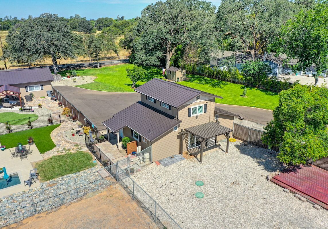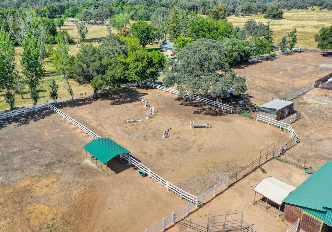 Welcome to this equestrian’s dream, exceptionally maintained and enhanced 4.8-acre property. The flat parcel features 2 houses: a single-story main house with 4 bedrooms and 2.5 bathrooms and a 1-bedroom, 1 bathroom guest house with kitchenette, living space, loft, and laundry. The main house offers an open floor plan, Coretec vinyl plank flooring, shutters, crown molding, and a whole house fan. The horse amenities include a Castlebrook raised center aisle barn with 4 stalls, feed room/hay storage, tack room and optional Dutch doors, a full-sized riding arena with a decomposed granite base, turnout paddock, and multiple pastures and pen areas. Additionally, the fully fenced acreage boasts a private iron gate entry, pebbletec pool with Cabo shelf, Generac 22kw generator, goat barn with 2 stalls and 2 run in shelters, 3 sheds, trailer pad, and a ~1,200 sq. ft. metal shop with 220 electrical. To top it off, this property also has Vulcan fire resistant vents and a 2,500-gallon holding tank with connection for the fire department.