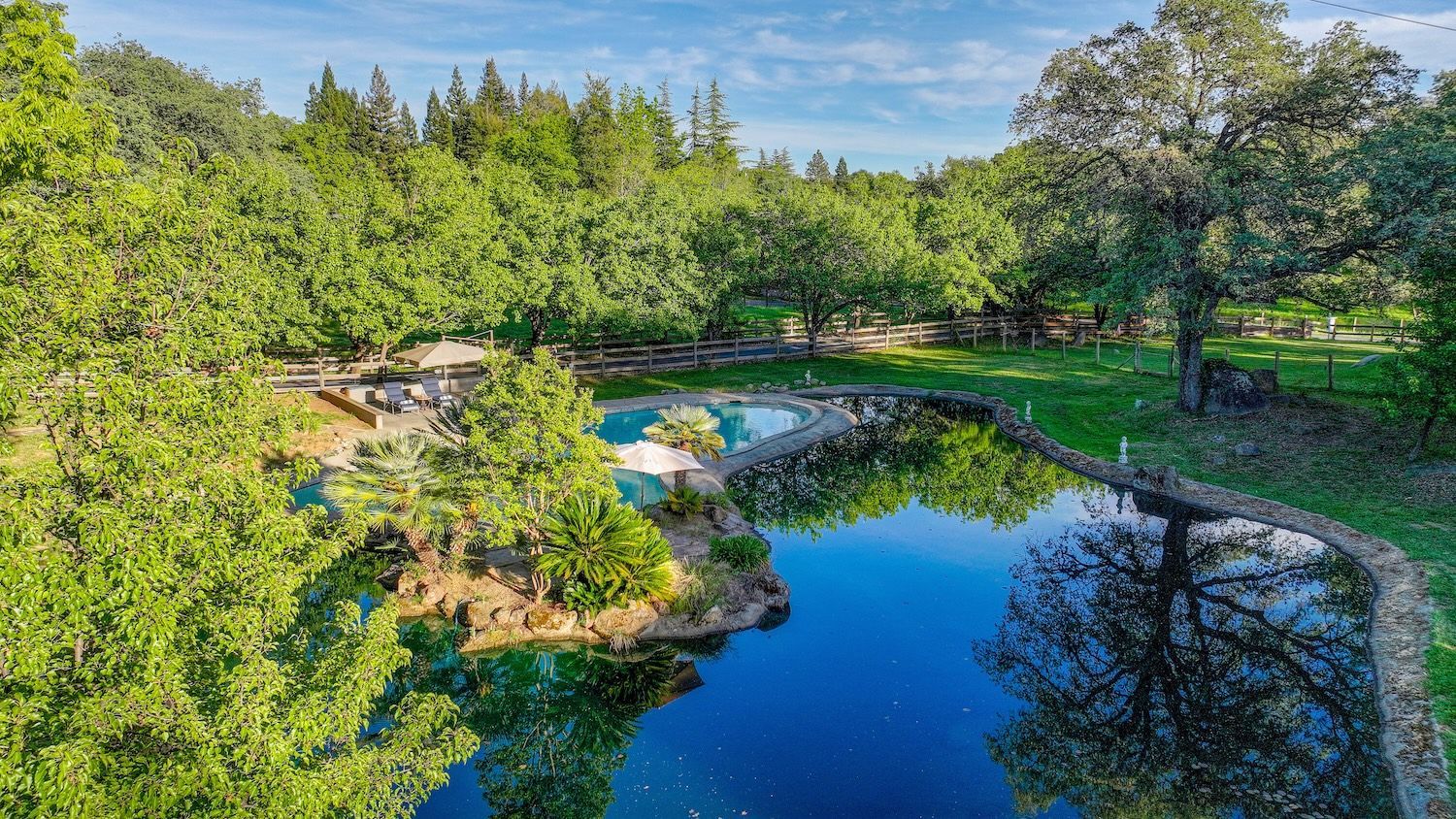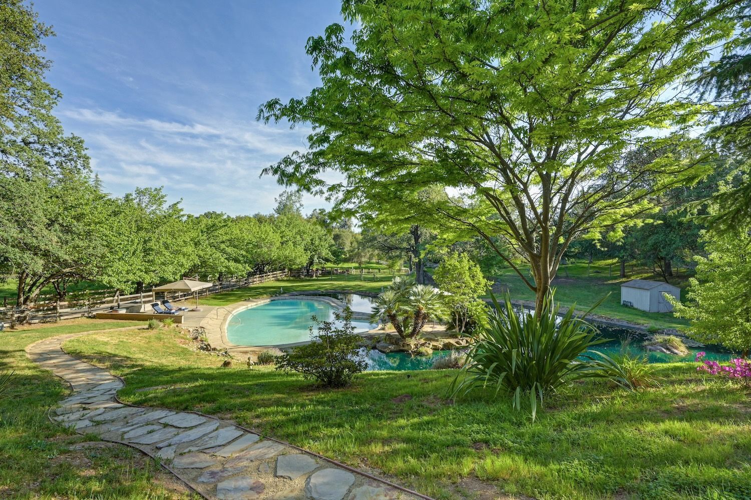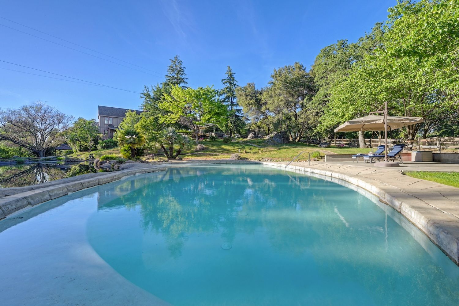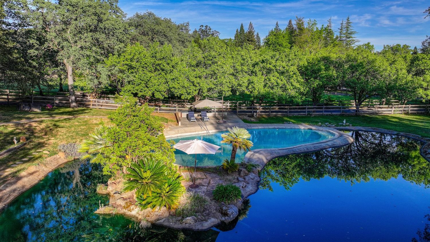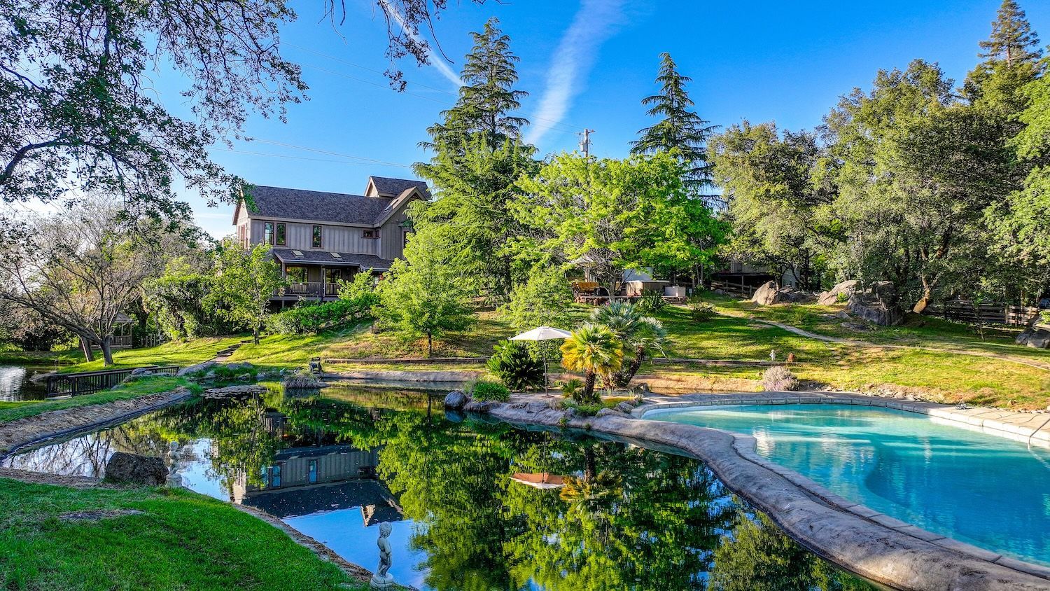 Discover a one-of-a-kind modern-meets-farmhouse retreat on nearly 5 private acres perched up high on a knoll with the most incredible views and sunsets in sought-after Kingmont Estates in the heart of Loomis. Walk, bike, horse to Folsom Lake Trails right from your property. Fully renovated by esteemed contractors, both the ~4,631 square foot main residence and ~1,089 square foot guest house blend elevated design with serene natural beauty. The main house offers expansive indoor/outdoor living with newer Milgard windows and doors, wide random plank white oak wood floors, designer lighting, and panoramic views and sunset vistas from every room. The chef's kitchen features Thermador appliances, a walk-in pantry with beverage refrigerator, an oversized butcher-block island, and an adjacent prep kitchen/mudroom with exterior access. The thoughtful layout includes flexible spaces, a formal living room with a gas fireplace, bonus spaces on each level, en-suite bedrooms, and a private primary suite wing with its own balcony and abundant storage. A lower-level game room and wine room with separate access add even more versatility. Bathroom floors enjoy radiant heat, and major system updates include newer roofing, HVAC, and a Tesla battery system. The equally impressive outdoors offers unmatched privacy, gated entry, meandering pathways, mature landscaping, formal hedge areas, fruit trees, and tranquil water features including a pond and a swimming pool. Enjoy multiple decks and patios, a standalone spa, ~640 sq. ft. barn, ~300 sq. ft. workshop, gazebo, and fully fenced grounds served by ditch, well, and public water. The remodeled guest house lives independently with its own deck, full kitchen, separate utilities, and additional office/bedroom flexibility, ideal for multi-generational living, guests, or income potential. A rare opportunity to own a secluded, beautifully renovated Loomis estate with views, character, and modern functionality in every direction..