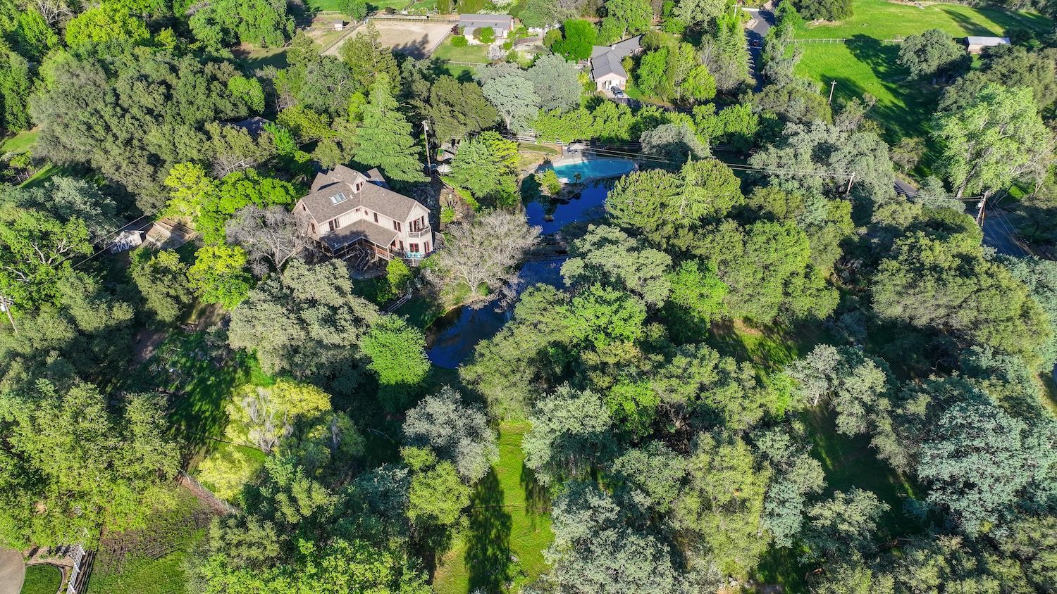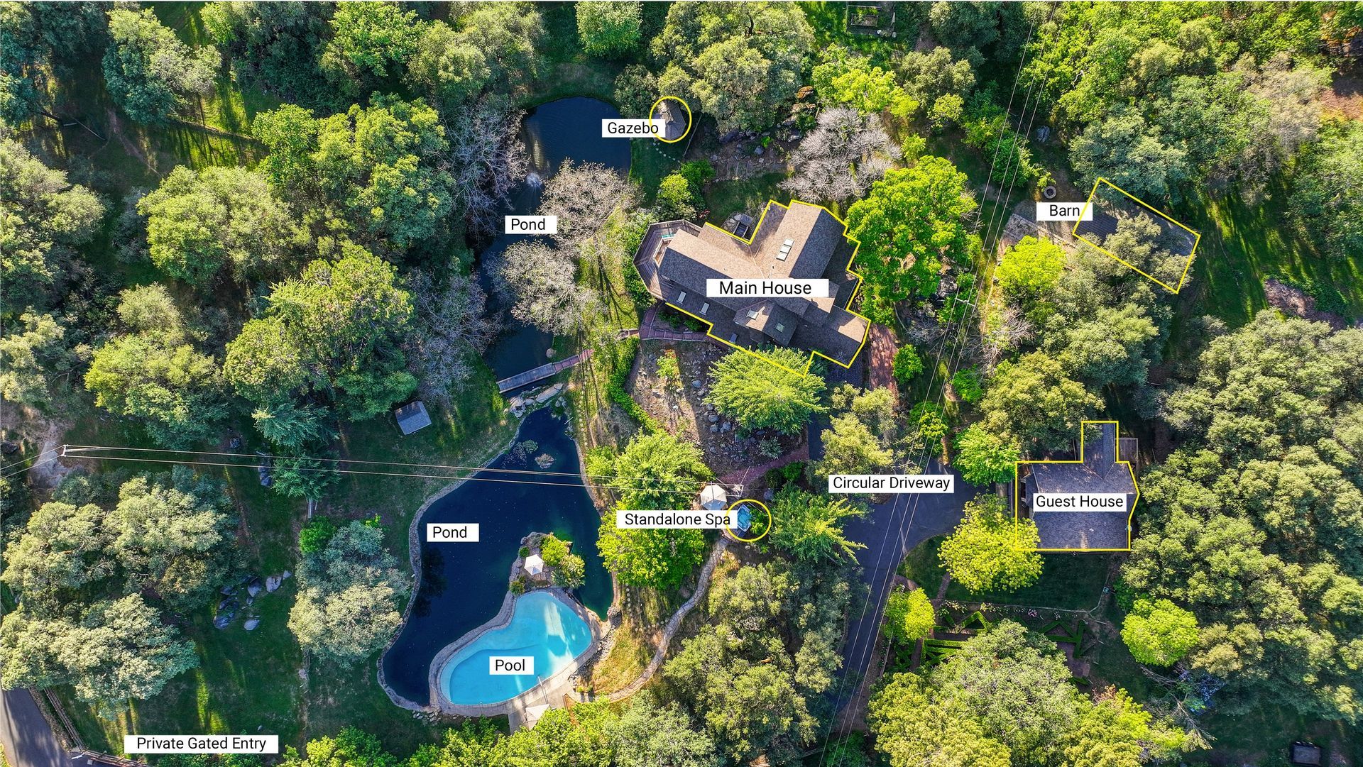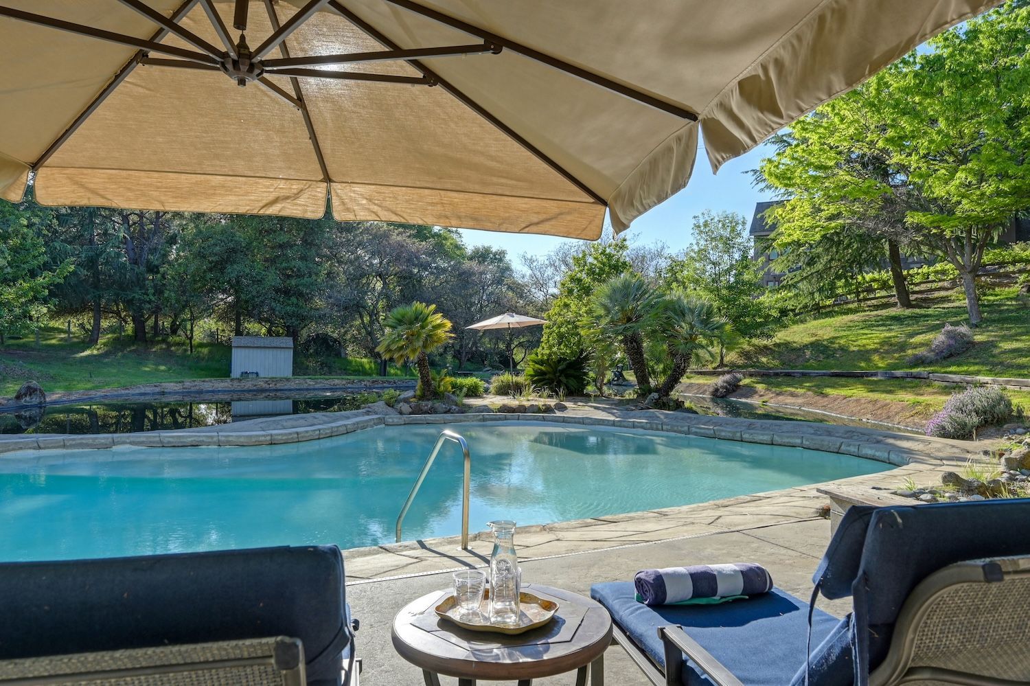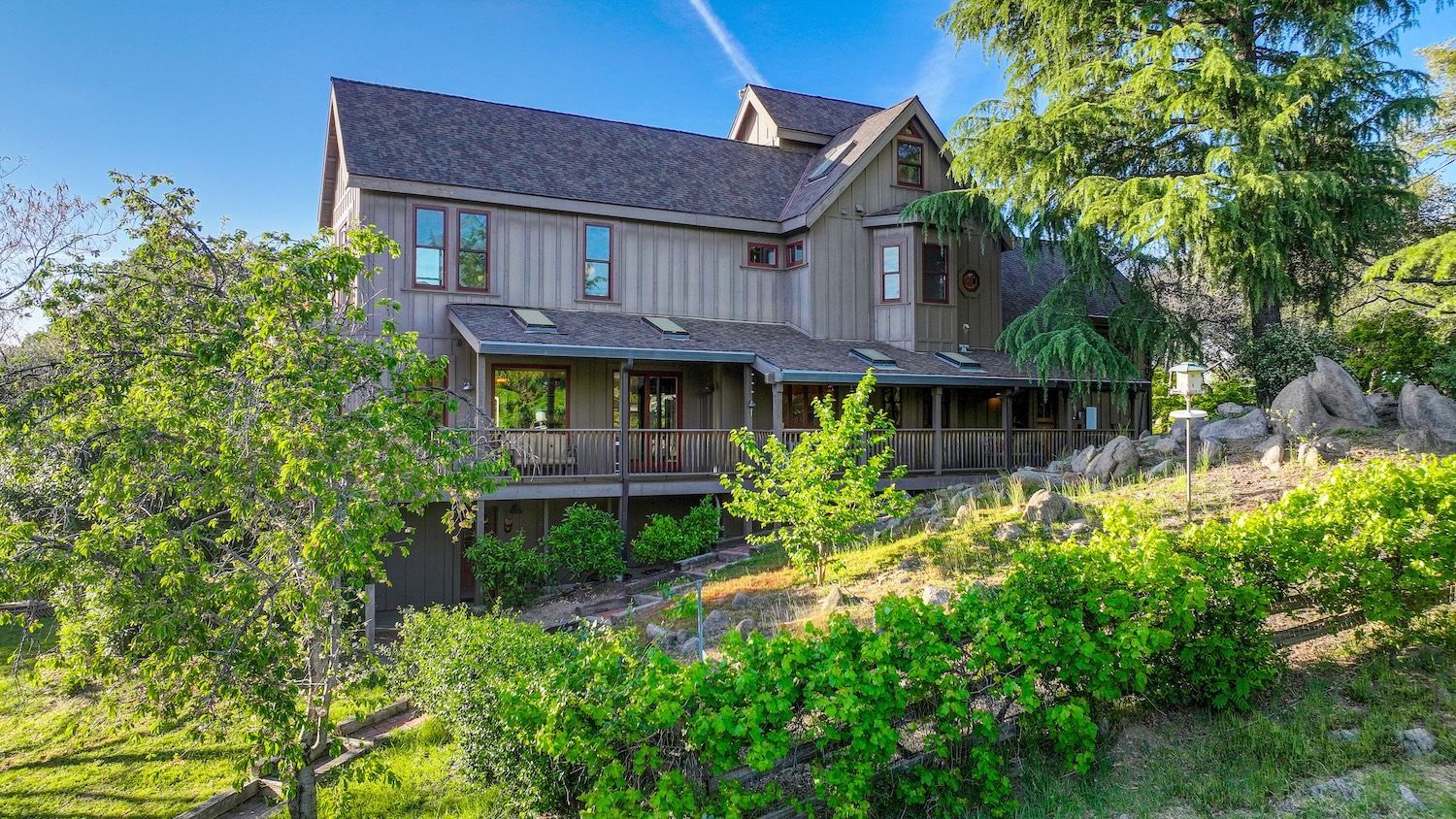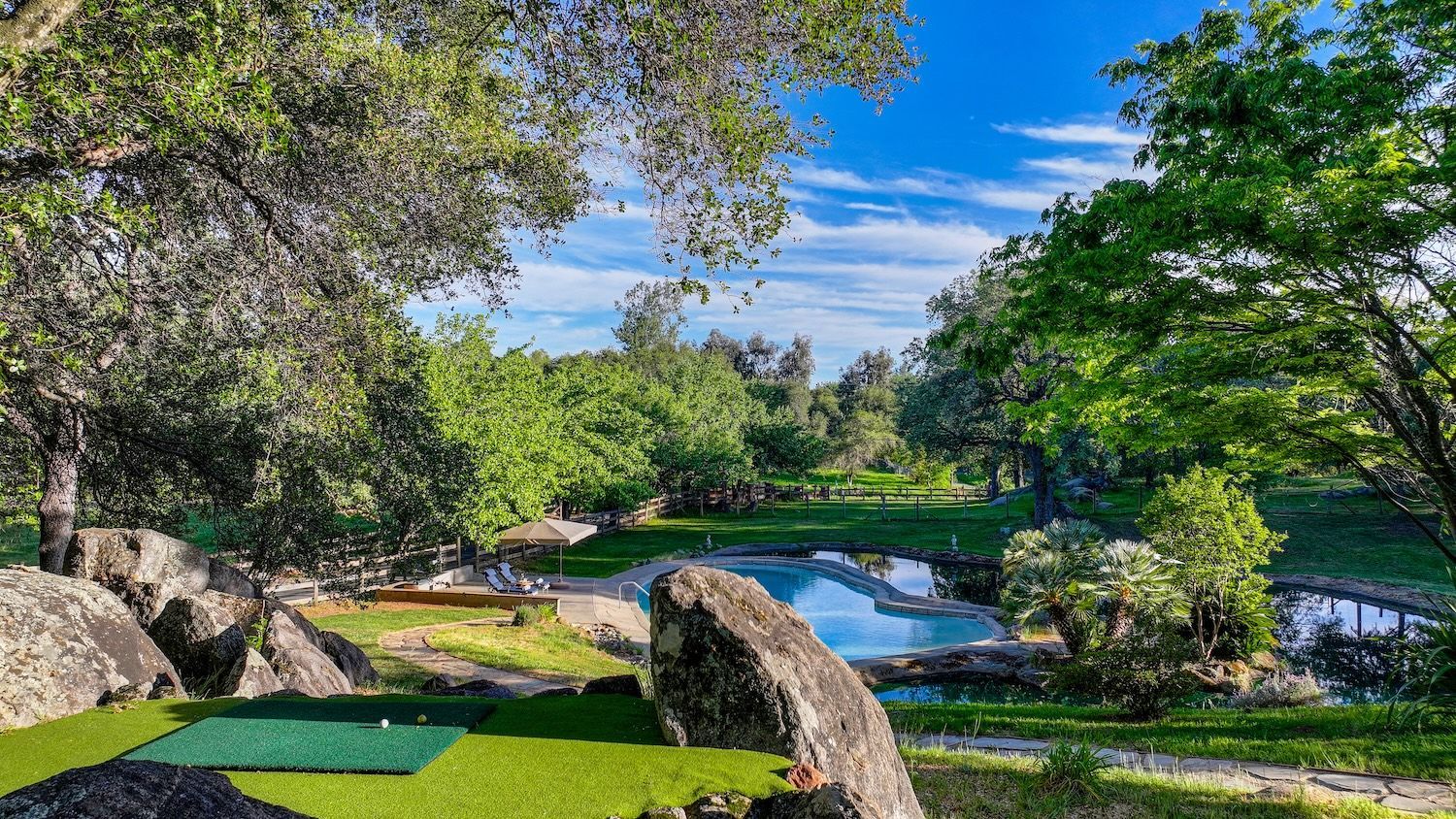 Discover a one-of-a-kind modern-meets-farmhouse retreat on nearly 5 private acres perched up high on a knoll with the most incredible views and sunsets in sought-after Kingmont Estates in the heart of Loomis. Walk, bike, horse to Folsom Lake Trails right from your property. Fully renovated by esteemed contractors, both the ~4,631 square foot main residence and ~1,089 square foot guest house blend elevated design with serene natural beauty. The main house offers expansive indoor/outdoor living with newer Milgard windows and doors, wide random plank white oak wood floors, designer lighting, and panoramic views and sunset vistas from every room. The chef's kitchen features Thermador appliances, a walk-in pantry with beverage refrigerator, an oversized butcher-block island, and an adjacent prep kitchen/mudroom with exterior access. The thoughtful layout includes flexible spaces, a formal living room with a gas fireplace, bonus spaces on each level, en-suite bedrooms, and a private primary suite wing with its own balcony and abundant storage. A lower-level game room and wine room with separate access add even more versatility. Bathroom floors enjoy radiant heat, and major system updates include newer roofing, HVAC, and a Tesla battery system. The equally impressive outdoors offers unmatched privacy, gated entry, meandering pathways, mature landscaping, formal hedge areas, fruit trees, and tranquil water features including a pond and a swimming pool. Enjoy multiple decks and patios, a standalone spa, ~640 sq. ft. barn, ~300 sq. ft. workshop, gazebo, and fully fenced grounds served by ditch, well, and public water. The remodeled guest house lives independently with its own deck, full kitchen, separate utilities, and additional office/bedroom flexibility, ideal for multi-generational living, guests, or income potential. A rare opportunity to own a secluded, beautifully renovated Loomis estate with views, character, and modern functionality in every direction..
