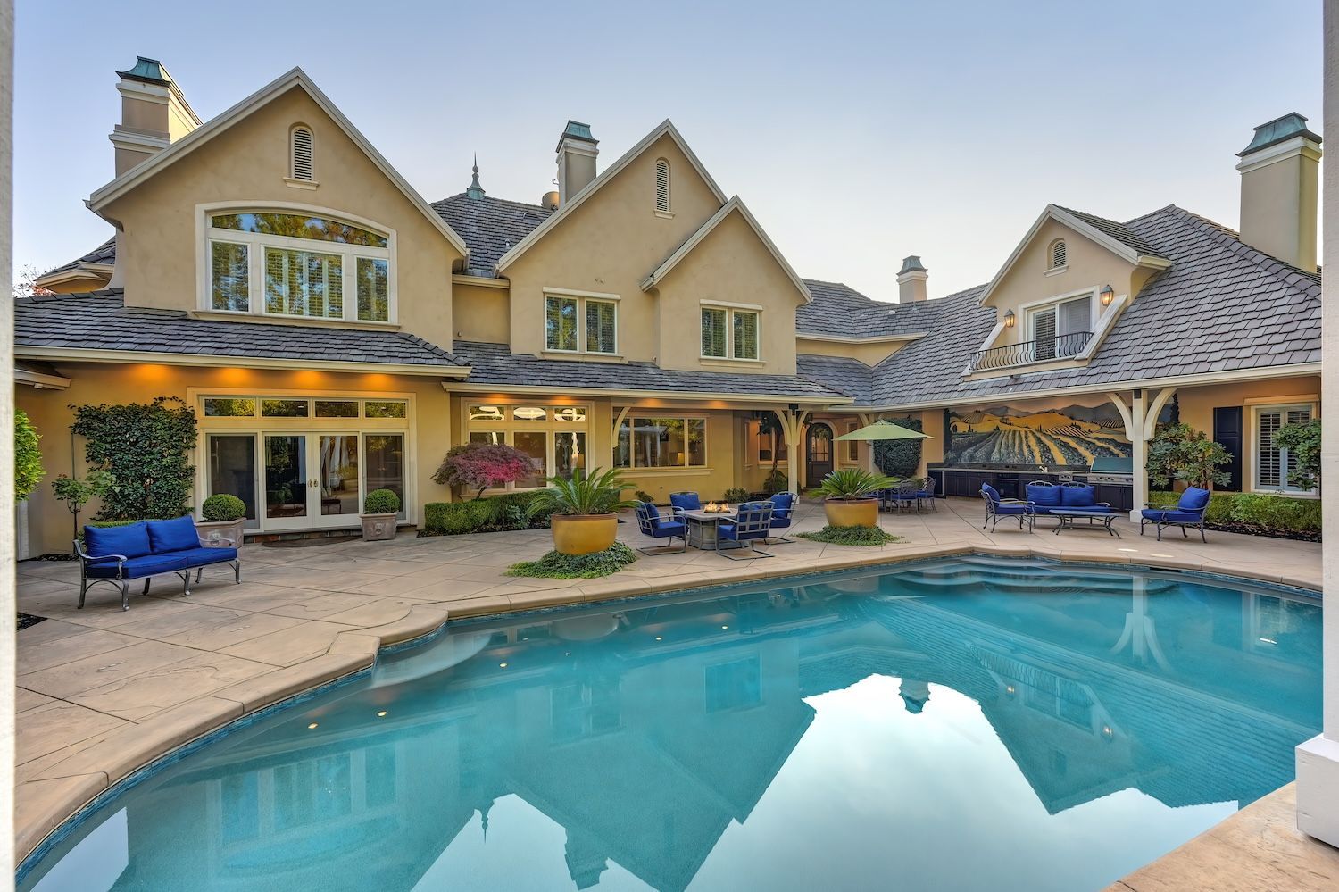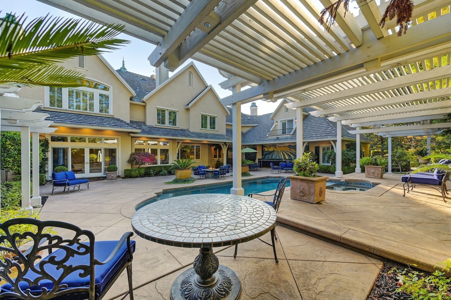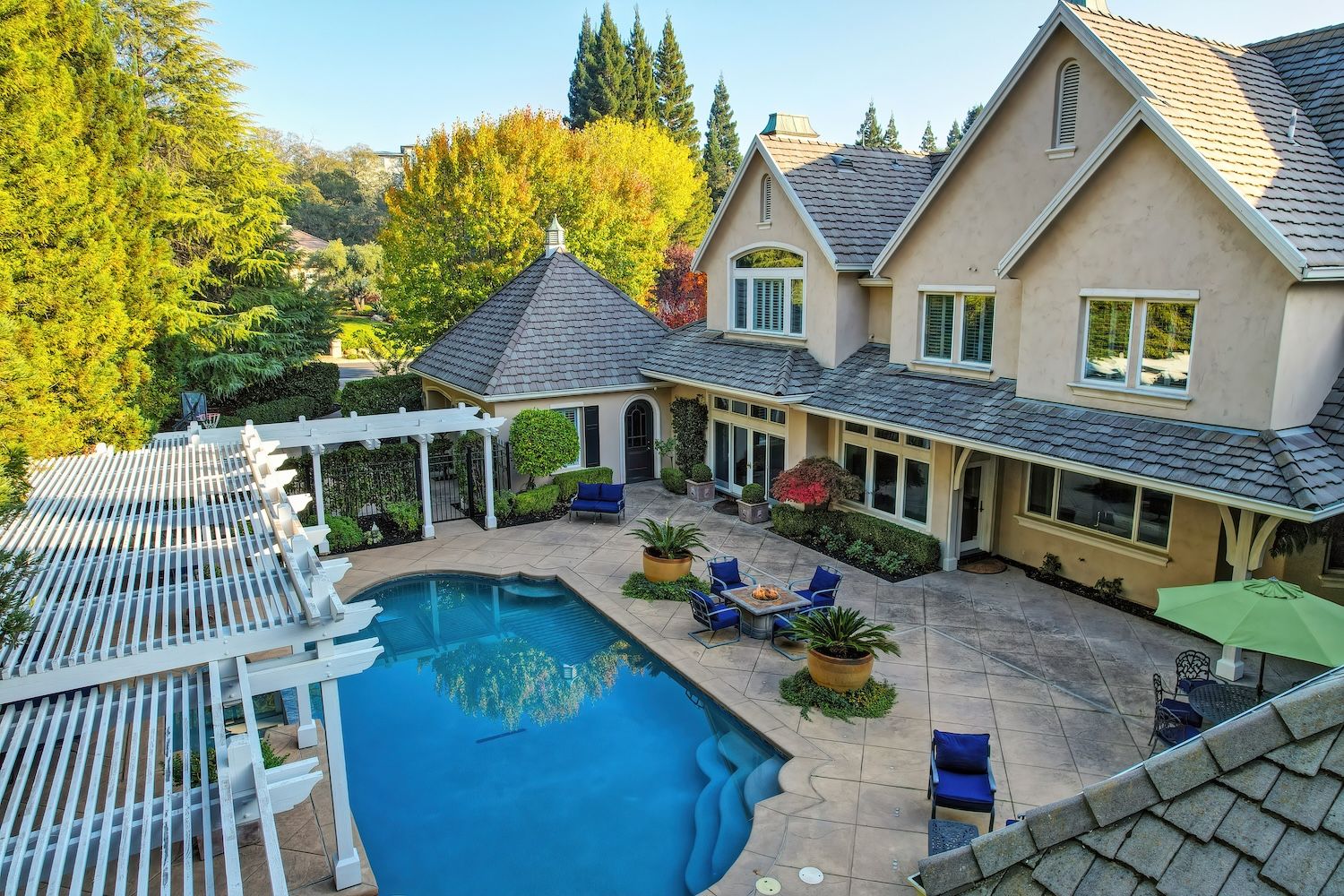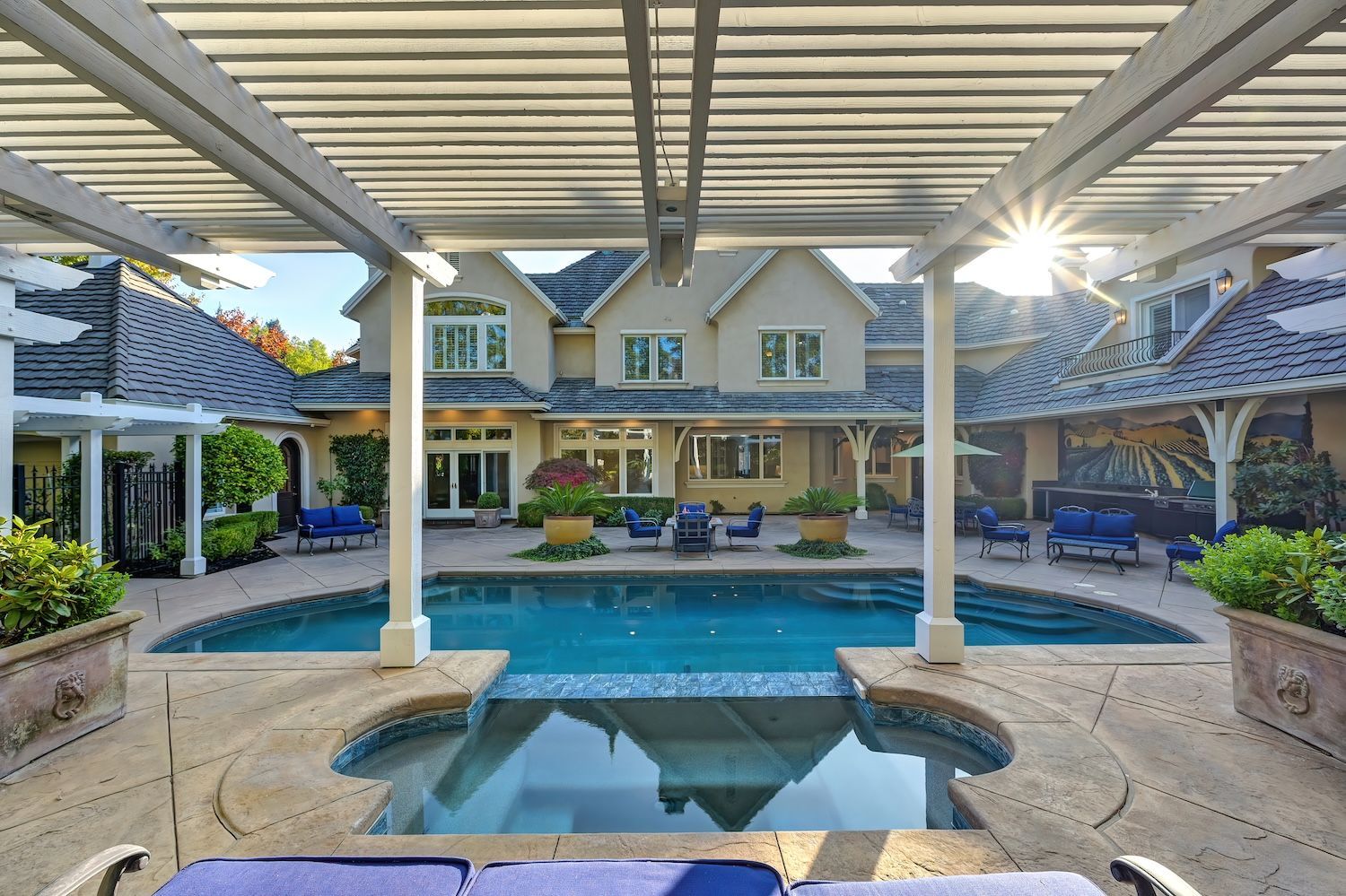 Welcome to 9624 Wexford Circle, a distinguished estate in guard-gated Wexford. Set on a premier corner lot with exceptional privacy, this residence showcases rare craftsmanship including triple crown molding, intricate millwork, arched doorways, leaded glass windows, and custom details with timeless quality. The updated kitchen shines with quartzite counters, a spacious island, and a separate prep dirty'' kitchen. An incredible theater room (optional first-floor junior suite), temperature-controlled wine cellar, elegant bar, European chandeliers, and a charming back staircase add unforgettable character. The primary suite features a large sitting room (possible office, nursery, or library), peaceful views, and a spa-like bathroom. Resort-style backyard has exceptional privacy with its mature trees that create a beautiful setting for the newly resurfaced pool, outdoor kitchen, and manicured landscaping. To top it off, the property has 3 driveways for guests/overflow parking and 5 garage spaces including a 3-car oversized attached and a 2-car detached. With golf-cart access to Granite Bay Golf Club, private community tennis and pickleball courts, and Eureka Union schools, this remarkable property blends luxury and timeless design in one of Granite Bay's most coveted communities..